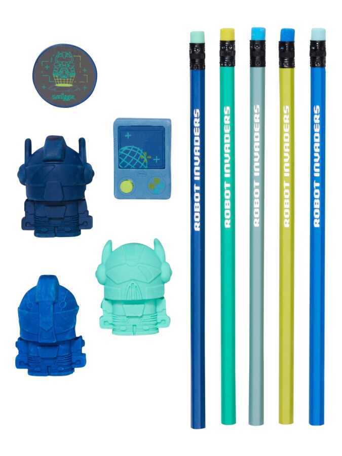 Fill your pencil case with fun stationery with the Eraser Pencil Box! Includes 5 scented novelty erasers, 5 gray pencils, and a sharpener.