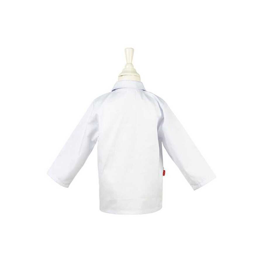 The set includes: White doctor's coat that closes with hidden snaps (red hospital crest on the left chest, ID window on the right) Two large transparent pockets at waist level White headband Toy syringe Wooden neurological hammer Stethoscope with wooden details.