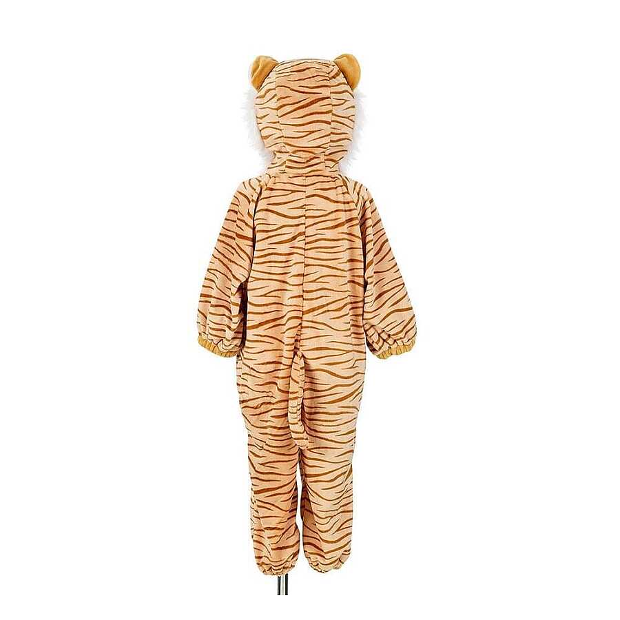 Made from soft velvet fabric, the costume provides all-day comfort. The attention to detail is immediately noticeable: cute white padded ears on the hood, white plush details around the head, and a long tail at the back. Dark brown patterns on a light beige background and a caramel-colored belly detail complete the tiger look.