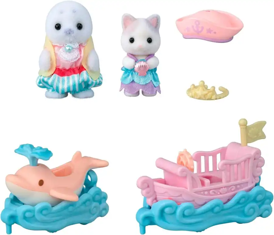 Embark on a fun amusement park ride in the Sylvanian world! This adorable set comes with two amusement park rides, Baby Seal and Baby Latte Cat Cradle. The boat gently rocks back and forth, while the dolphin ride moves up and down with the waves.
