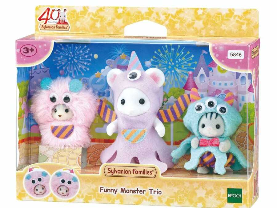 Designed to celebrate the 40th anniversary of Sylvanian Families, this funny costume trio set features three adorable dolls: Marshmallow Mouse Girl, Grey Cat doll, and Husky doll. Each one stands out with their colorful and fun monster costumes.