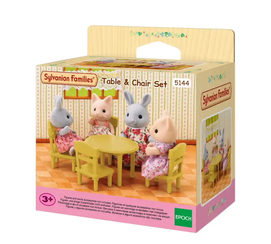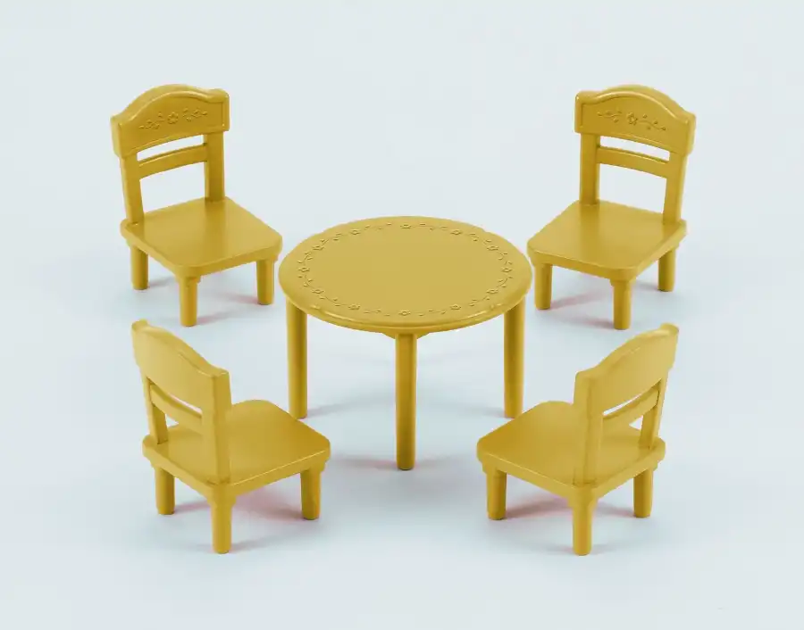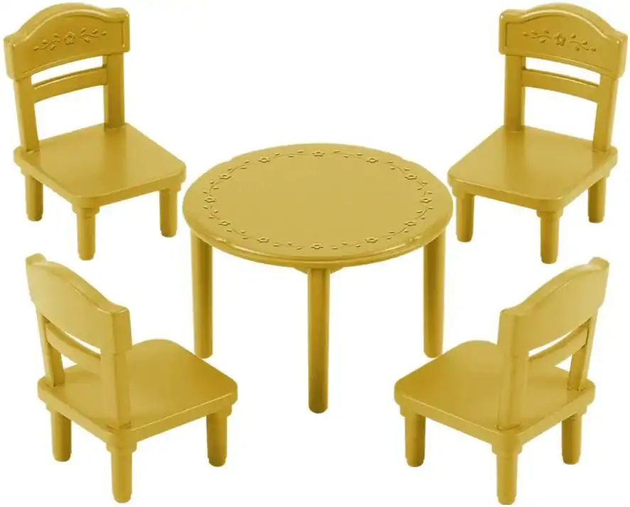 A table and chair set to add to your Sylvanian Families collection! This set includes 1 round table and 4 chairs.