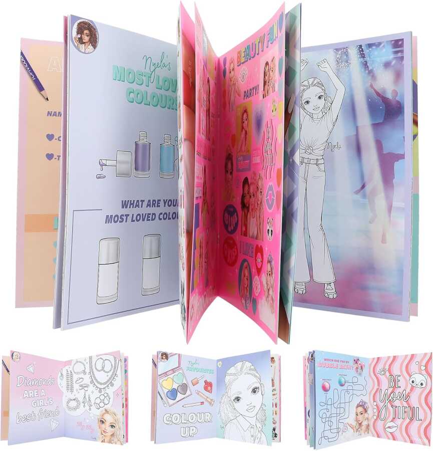TOP Model Beauty Fun coloring book, pre-printed model figures for coloring and designing Creative book with 3 sticker sheets with beautiful paper and foil stickers This set, which fosters creativity, consists of a sticker and coloring book for designing, coloring and sticking in your spare time.