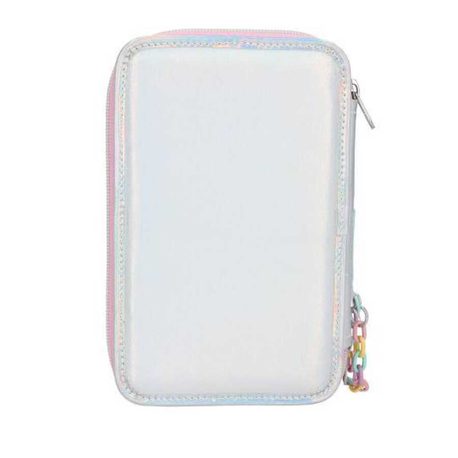 The pencil case is filled with: 1 x Thick pencil 1 x Thin pencil 1 x Glue stick 1 x Eraser 1 x Sharpener for thick and thin pencils 1 x Small round scissors 1 x 15 cm ruler 18 x Coloured pencils in different colours 18 x Felt tip pens in different colours 1 x Mirror.