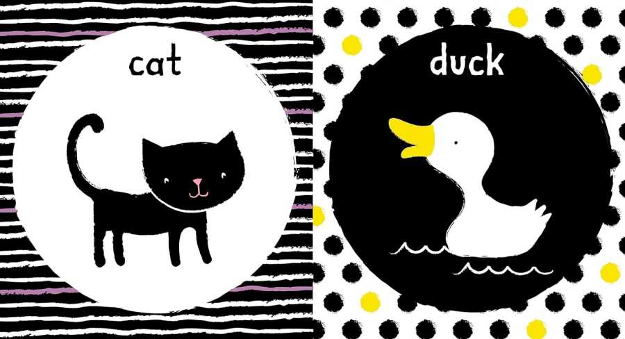 Illustrations predominantly in black and white with occasional vivid color touches are specifically designed to support the focusing abilities of very young babies.