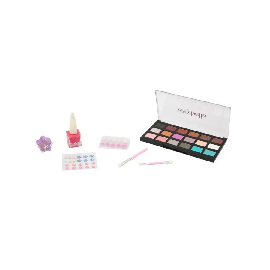 Set Contents: Eyeshadow palette, 2 eyeshadow applicators, 1 nail polish, 1 fake nail sticker, 1 nail sticker, 1 lip balm.