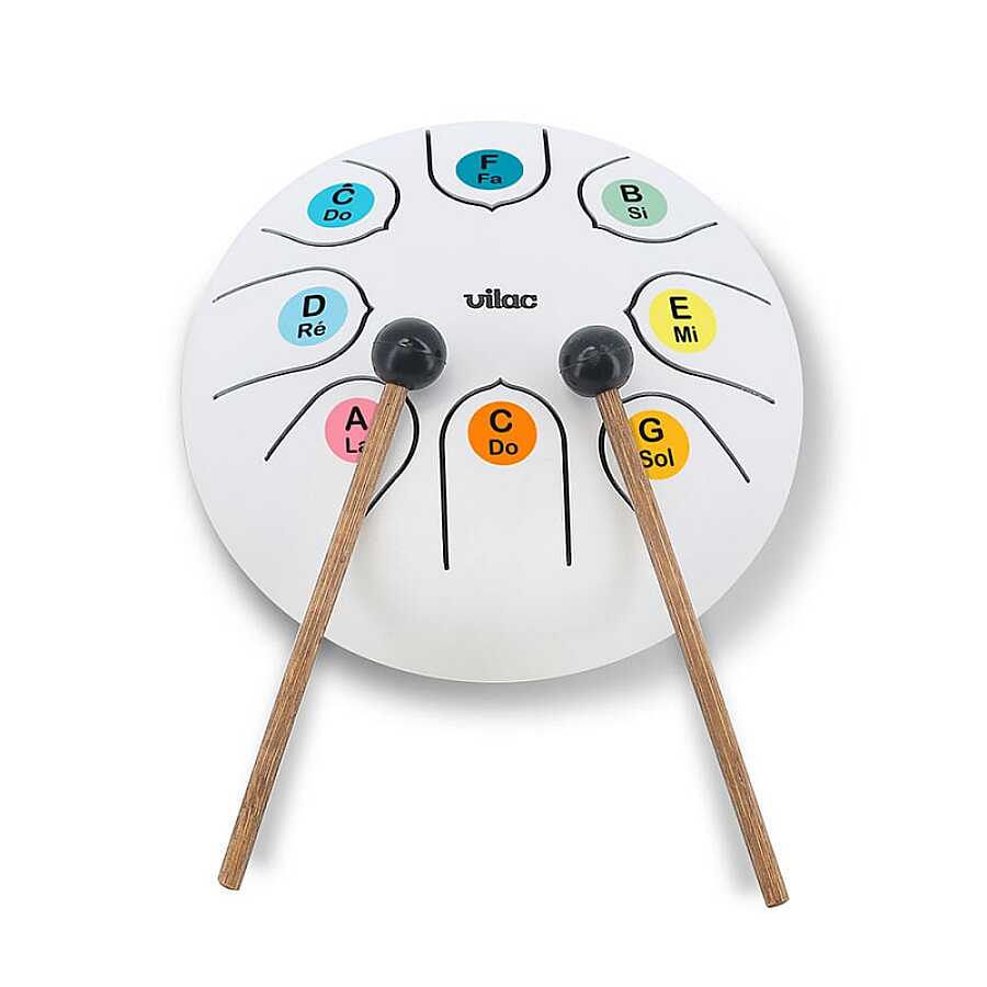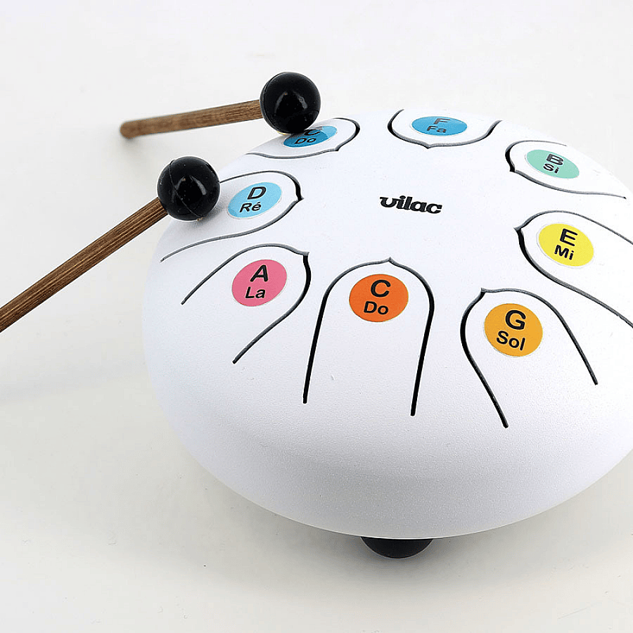The Vilac Metal Tongue Drum - Blanc Neige, which helps little ones discover their sense of rhythm, offers both a visual and auditory art experience with its elegant white snow tone and soft sound.