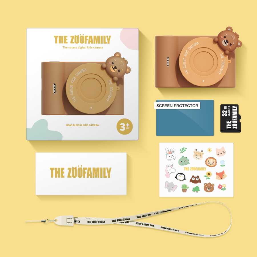 02 / printExtras: Lens cap, sticker setEnvironmentally Friendly: BPA-free & BPS-free printing paperBox Contents: Zoo Family Bear C5 Digital Camera (bear themed)32 GB microSD card (pre-installed)Bear patterned lens coverSilicone protective case2-in-1 USB charging & strap cableNeck strap / strapSticker setUser manual: This model does not have a built-in photo printer.