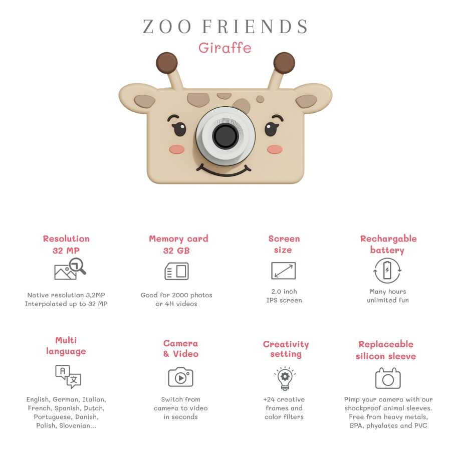 Box Contents: Zoo Family Giraffe C1 Digital Camera (giraffe design) 32 GB microSD card (pre-installed) USB charging and data cable (some sets also add a USB card reader) Silicone protective case (giraffe figure, removable and washable) Strap / wrist strap (to prevent it from falling from the child's hand) Sticker set (to personalize the camera) User manual (multilingual): This model does not have a built-in photo printer.