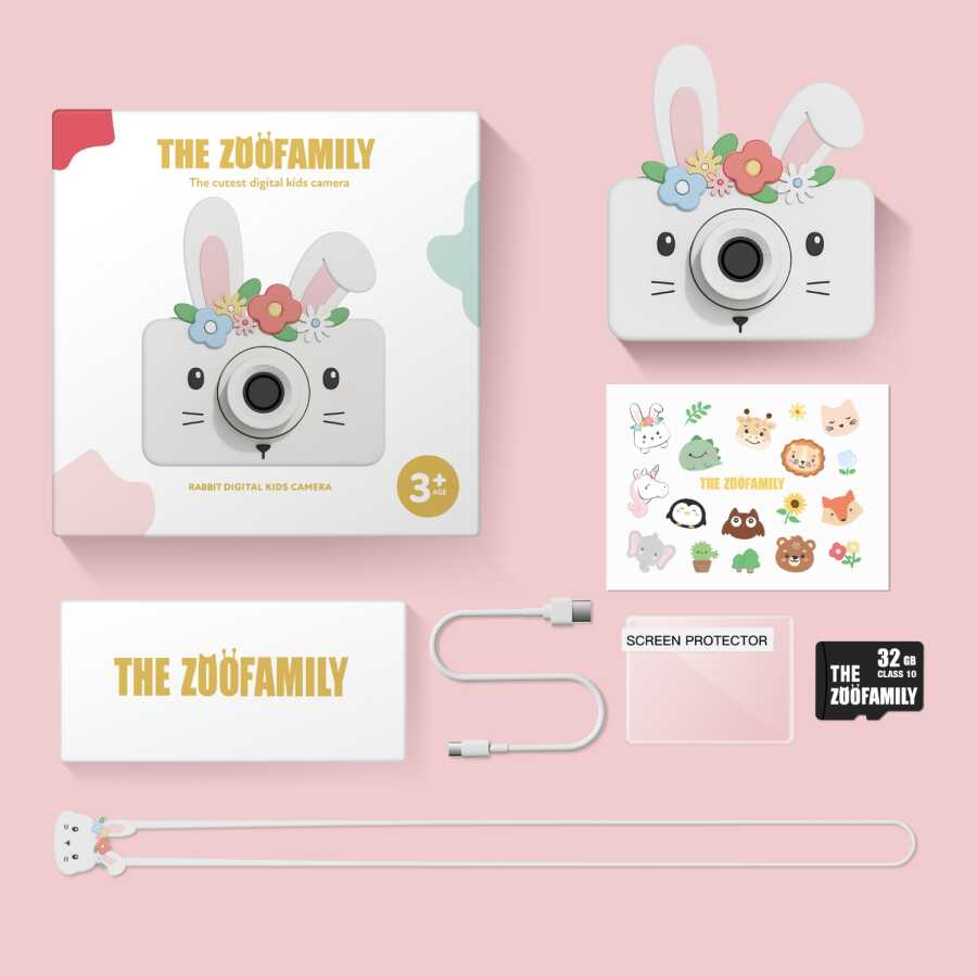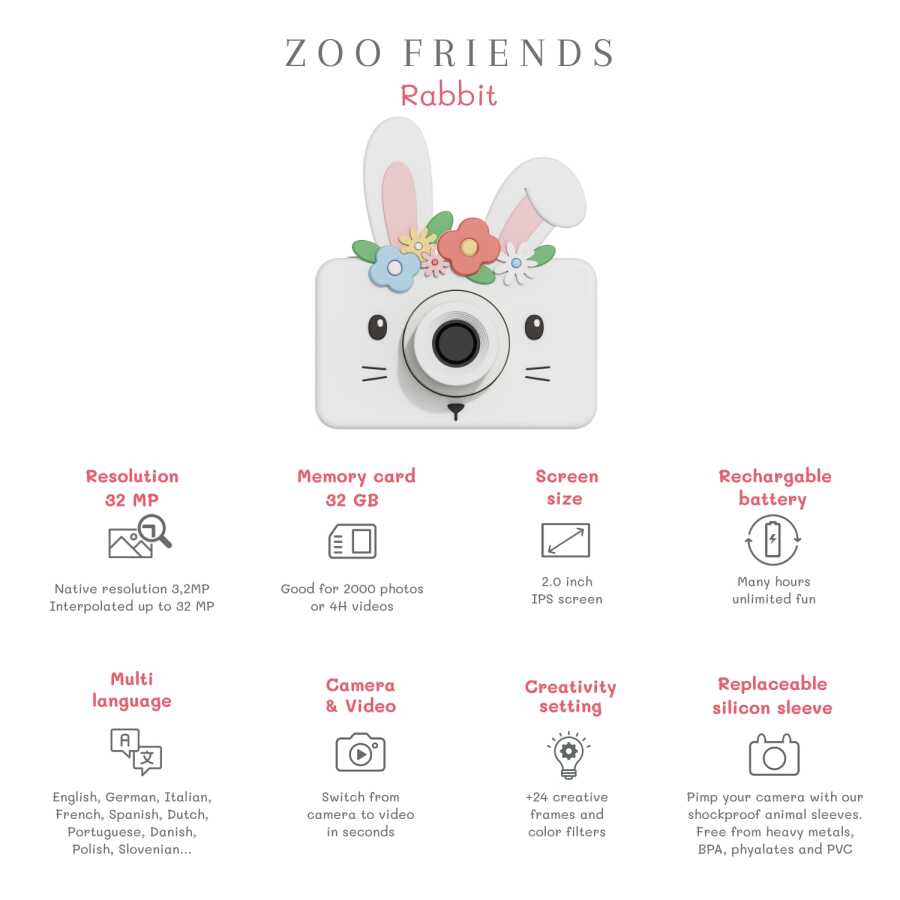 1 cm Screen: 2 inches IPS Function: Photo + video in one Features: Lightweight, durable and easy to use Fun Content: 20+ frames, filters and stickers Storage: 32 GB microSD card included (~2000 photos or ~4 hours of video) Battery: 1000 mAh internal rechargeable battery, ~2 hours of continuous use on a single charge Case: Removable, silicone protective case Durability: Shock absorbing, safe material Menu: Multi-lingual interface Box Contents: Zoo Family Rabbit Flower C1 Digital Camera (rabbit-flower themed) 32 GB microSD card (pre-installed) USB charging and data cable (some packages may also include a USB card reader) Silicone protective case (rabbit-shaped, removable and washable) Strap / Wrist strap (to prevent it from falling from the child's hand) Sticker set (to personalize the camera) User manual (multilingual): This model does not have a built-in photo printer.
