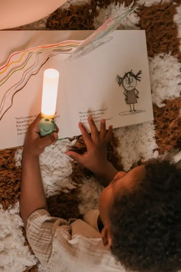 Its cute dinosaur design, soft silicone surface, and child-friendly size make it easy to hold. It can be easily hung next to the bed or in a reading nook with its magnetic wall mount.