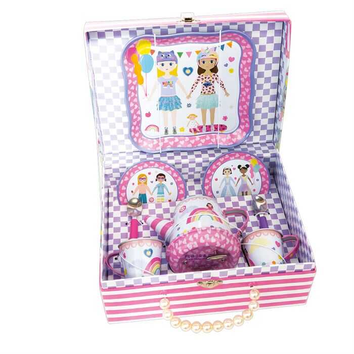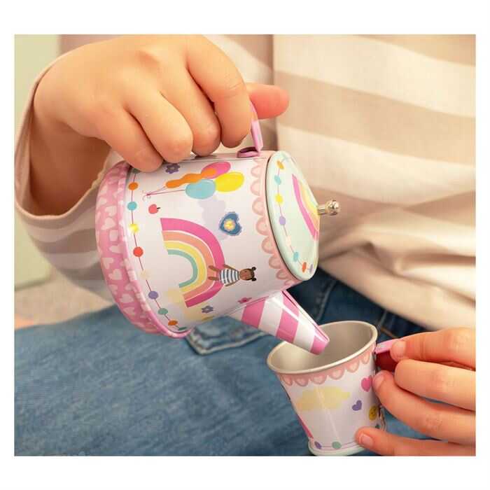 Geleneksel plastik setlerin aksine metal yapısıyla gerçeklik hissi uyandıran bu set, çocukların sosyal becerilerini ve paylaşma duygusunu geliştirir. Arkadaşlarıyla veya aileleriyle kuracakları sofralarda sofra adabını ve servis yapmayı eğlenerek öğrenirler. Şık tepsisi ve kapaklı çaydanlığı ile her ayrıntısı titizlikle düşünülmüş bu set, oda dekorasyonuna da şık bir dokunuş katacak niteliktedir.