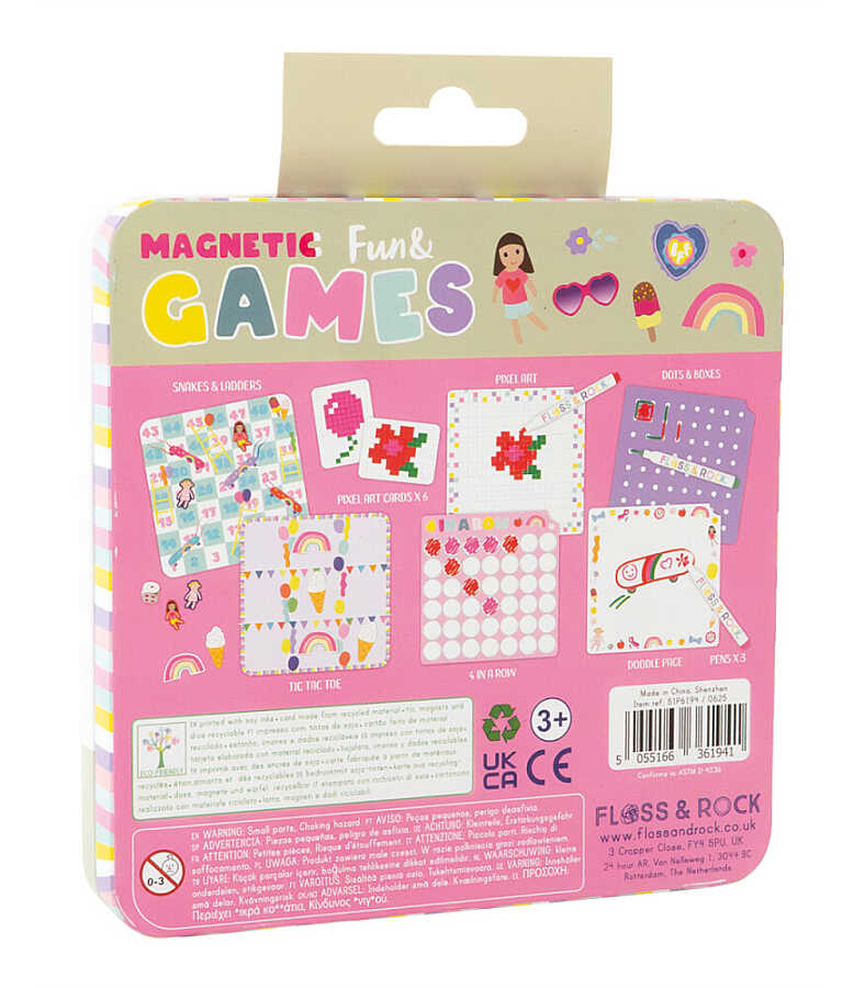 Contents: The set includes a magnetic box suitable for travel, where all the pieces can be stored, and contains 6 different reusable games including Snakes & Ladders, Three Stones, Pixel Art, Four Rows, Dots & Boxes.
