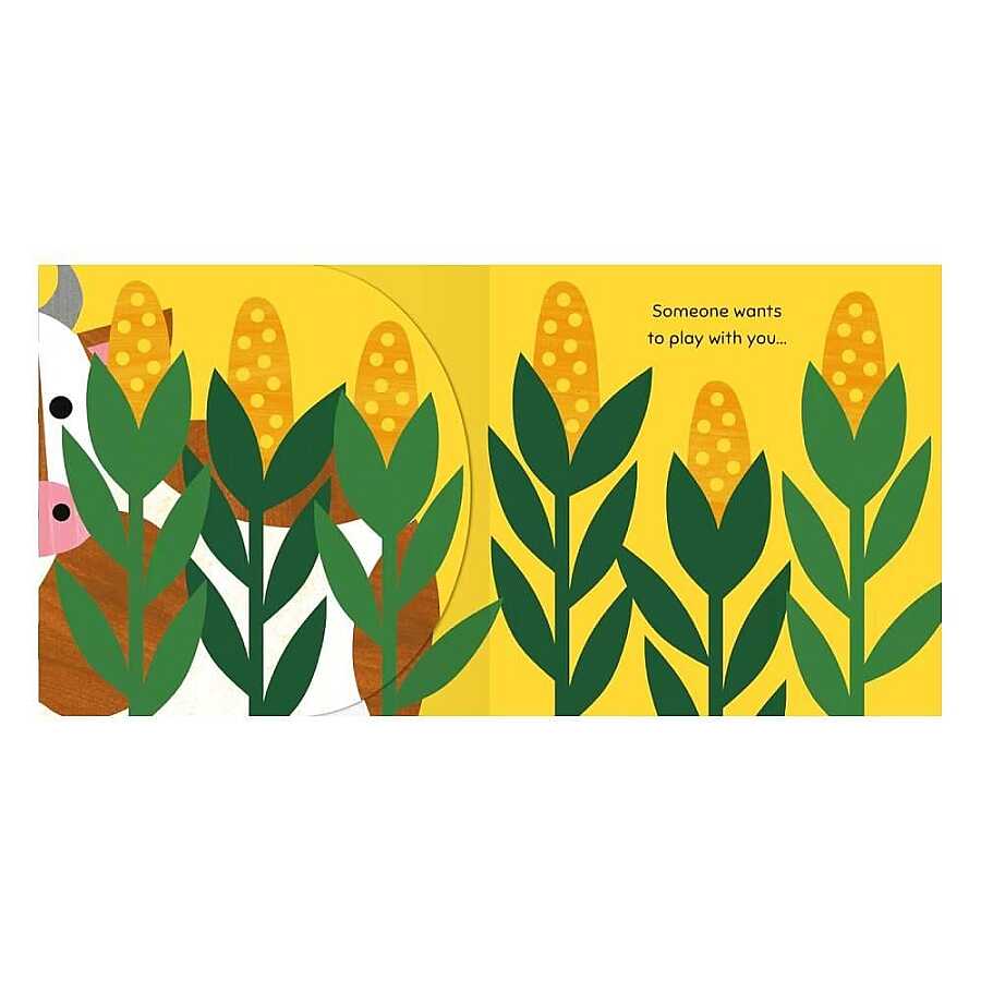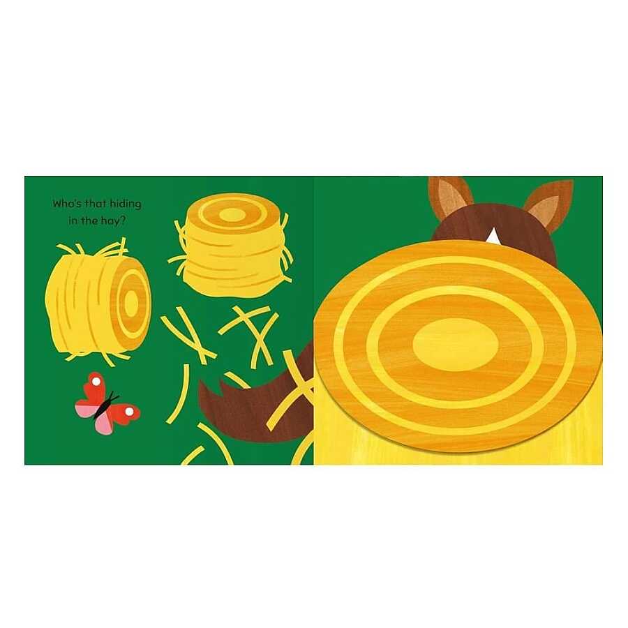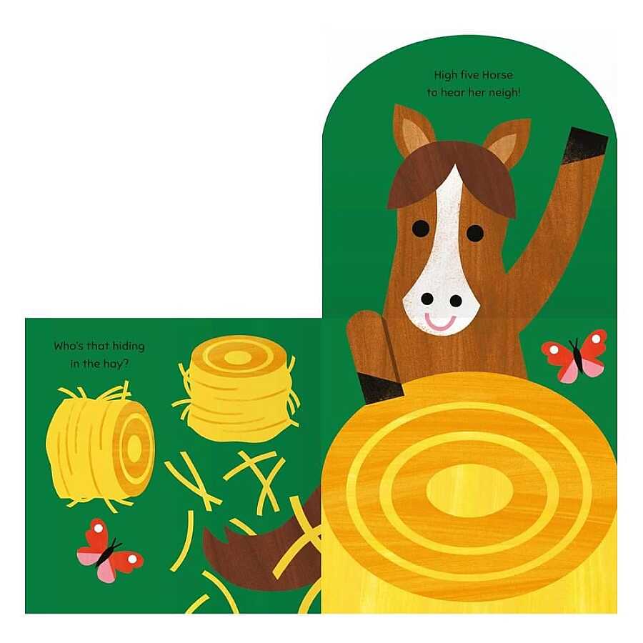 Çiftlikte; at, çoban köpeği, inek ve koyun gibi dost canlısı hayvanlarla tanışın. Neşeli ve kafiyeli metinler, bebekleri ve küçük çocukları büyük kapakları kaldırmaya ve altındaki hayvanlarla beşlik çakmaya teşvik eder.