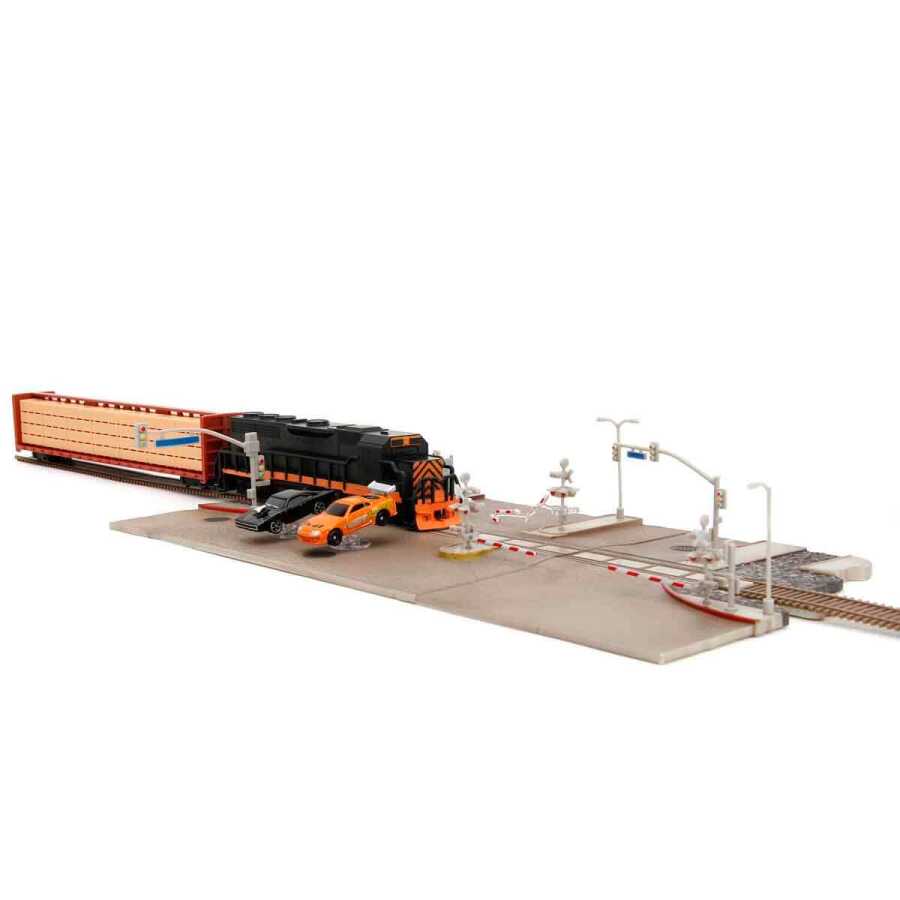 Details like a railroad crossing, an oncoming train, and a traffic light make the Fast & Furious Nano Train Scene Diorama even more realistic.