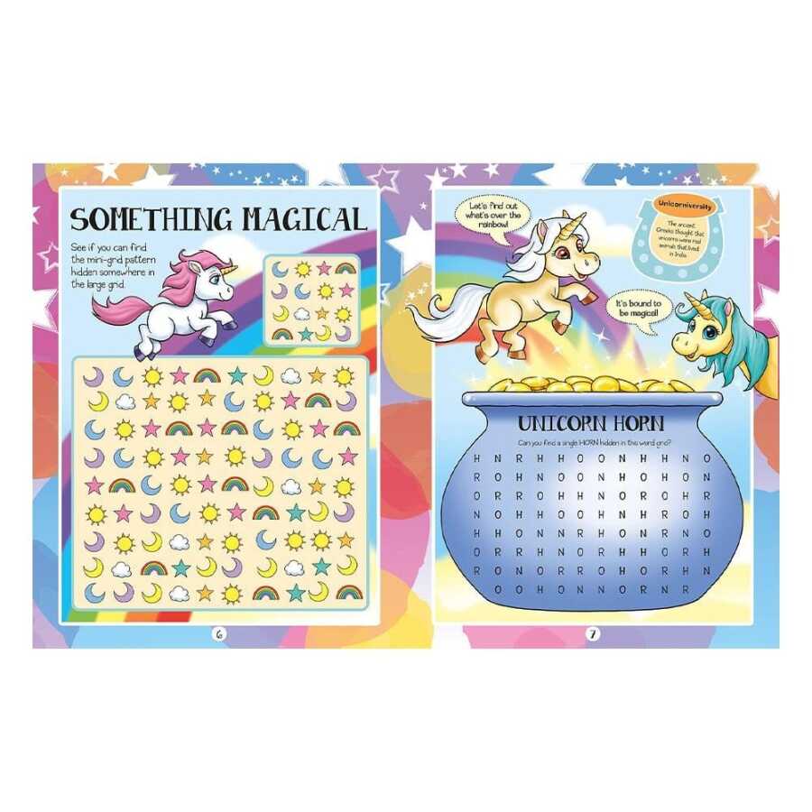 Renkli talimat kitabı, unicorn mitolojisi, eğlenceli bilgiler ve harika bulmacalarla dolu!