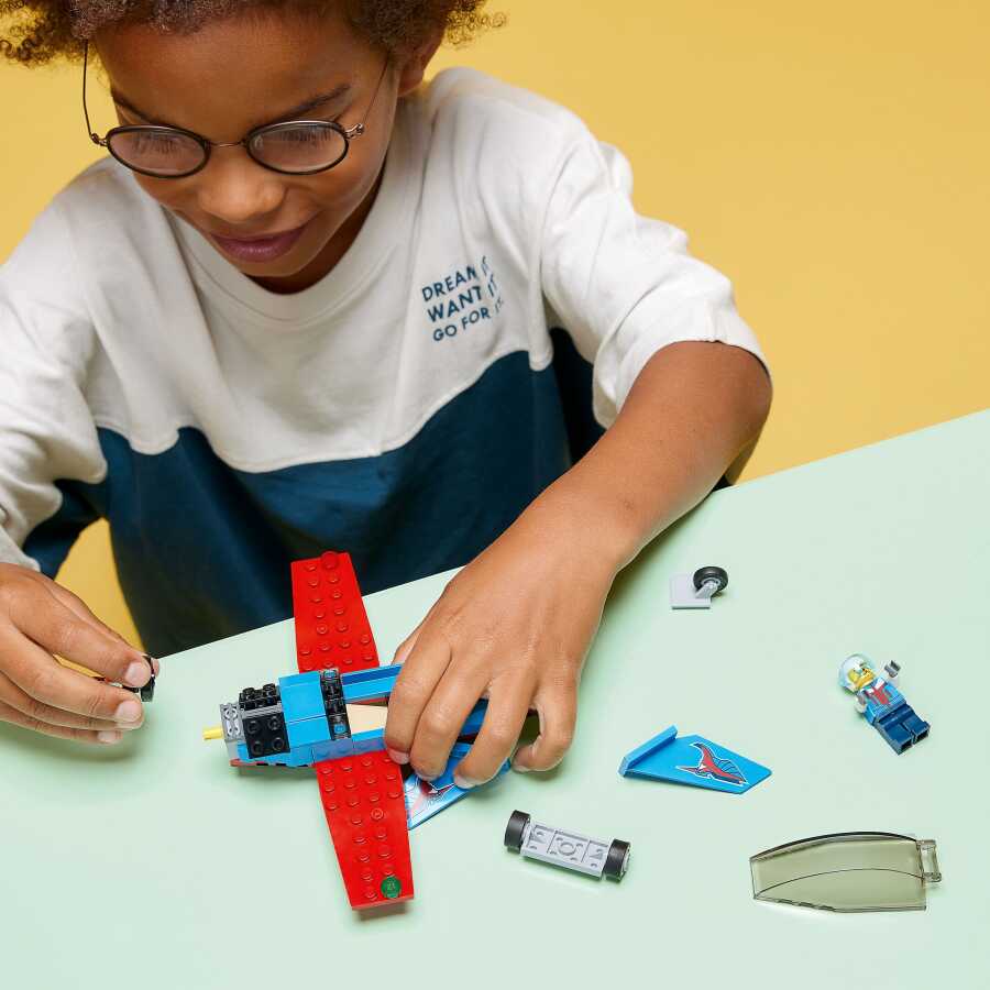 Stunt Plane setinde, güçlü bir akrobasi uçağı ve pilot minifigürü bulunur. Set ayrıca gösteri için kullanılabilecek ekstralar içerebilir, örneğin küçük bir pist veya hava alanı figürleri. Uçak, hareketli parçaları ve detaylı tasarımıyla çocukların gerçek bir hava akrobasisi deneyimi yaşamalarını sağlar.