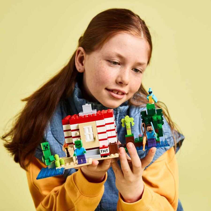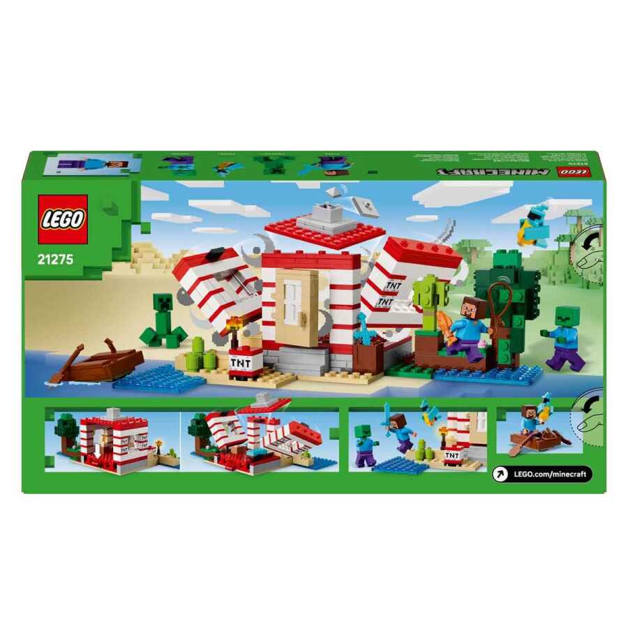 İnşa edilebilen ev, Minecraft orman biyomunda yer alır ve oyunun ikonik TNT öğesinin büyük ölçekli bir versiyonu gibi görünür. Çocuklar, yan taraftaki anahtarla tüm evi çökerten bir TNT patlatma fonksiyonunu tetikleyebilir. Ortalık yatıştığında, çocuklar evi yeniden inşa ederek bir sonraki maceralarına hazır hale getirebilir. Steve, Creeper ve zombi mini figürleri, hayal gücüne dayalı oyunları ve savaş aksiyonunu teşvik eder. Tekne, olta, balık, papağan ve orman yeşillikleri gibi orijinal LEGO Minecraft aksesuarları içerir. LEGO Builder uygulaması, çocuklara cihazlarını kullanarak modelleri 3 boyutlu yakınlaştırma ve döndürme eğlencesi sunar. 287 parça içerir.