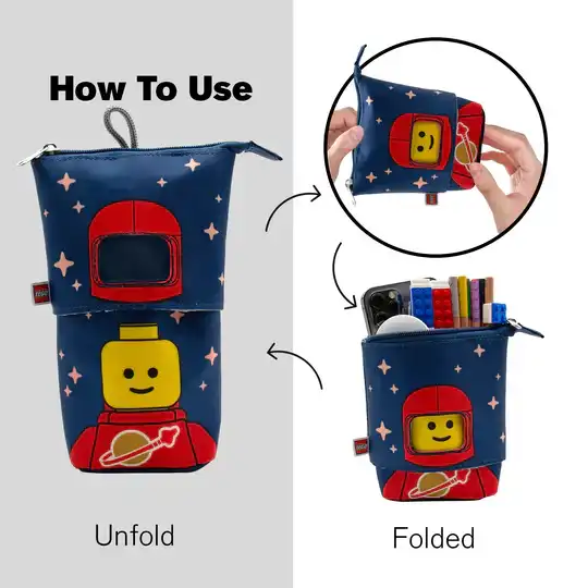 Okul masalarına uzay çağı şıklığını getirmeye hazır mısınız? Lego Pencil Case Pop Up Spaceman, ikonik kırmızı rengi ve eğlenceli "pop-up" mekanizmasıyla birlikte