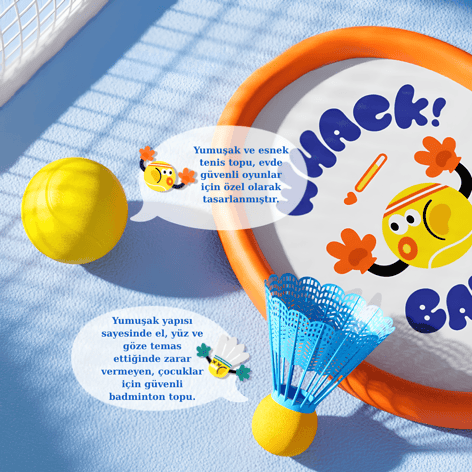 Kutu İçeriği: 2 raket, 1 tenis topu, 1 badminton topu, 1 ağ saklama çantası