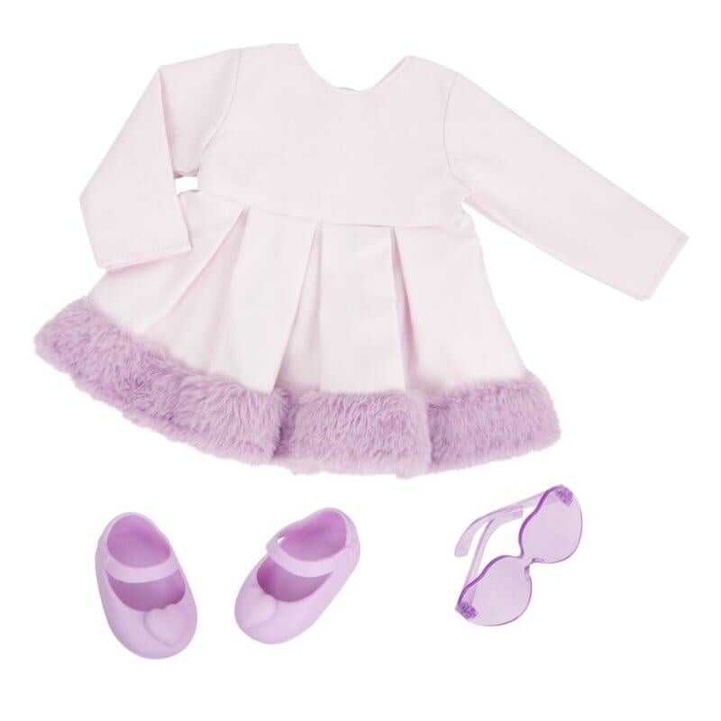 You can also transform her look with buns, ponytails, braids, and more! She comes in a stylish faux-fur-trimmed dress, heart-shaped sunglasses, and shoes with mini hearts on the nose.