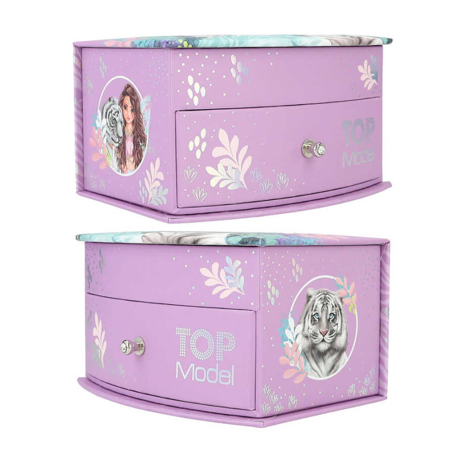 Sırlar ve hazineler için: Harika mor ve turkuaz tonlarındaki küçük TOP Model Tiger Love mücevher kutusu, güzel model kaplan motiflerine ve çekmece kulbunda ışıltılı bir yapay elmasa sahiptir.