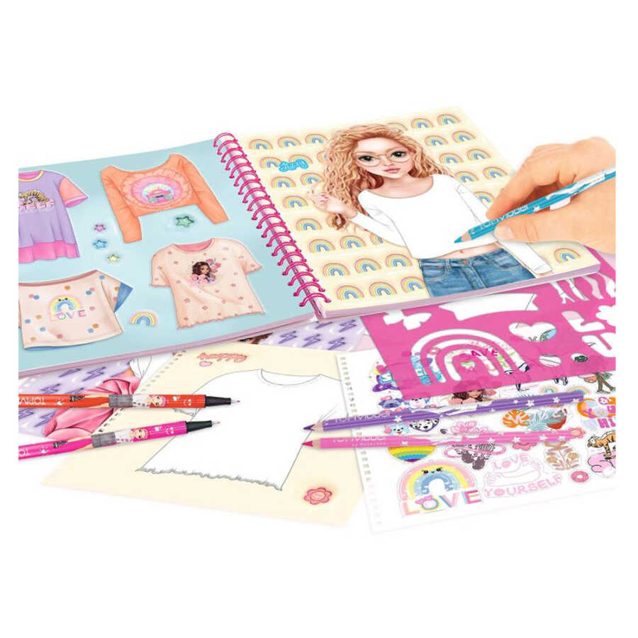 Top Model'in 60 sayfalık boyama kitabında tasarım fikirlerinizi bir tişörte taşıyabilirsiniz.
