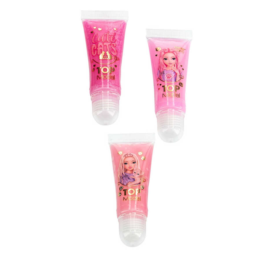 TOP Model'in dudak parlatıcısı seti, yaban mersini kokulu mor bir dudak parlatıcısı, şeftali kokulu şeftali renkli bir dudak parlatıcısı ve çilek kokulu pembe bir dudak parlatıcısından oluşur.