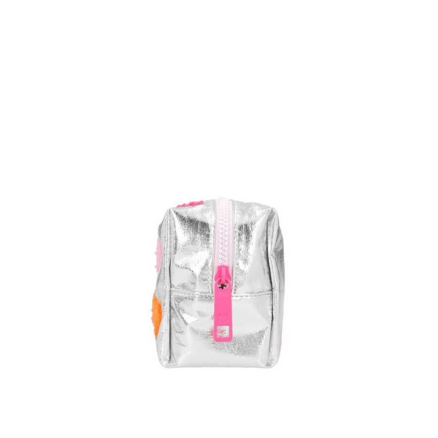 Parlak gümüş renkli, TOPModel Louise motifli; pembe ve turuncu tonlarda, aplike kalp detaylarıyla süslenmiş şık bir makyaj çantası veya kalemlik. Tüm favori makyaj ürünlerinizi ya da gerekli kırtasiye malzemelerinizi saklamak için sağlam fermuarlı geniş bir ana bölmeye sahiptir.