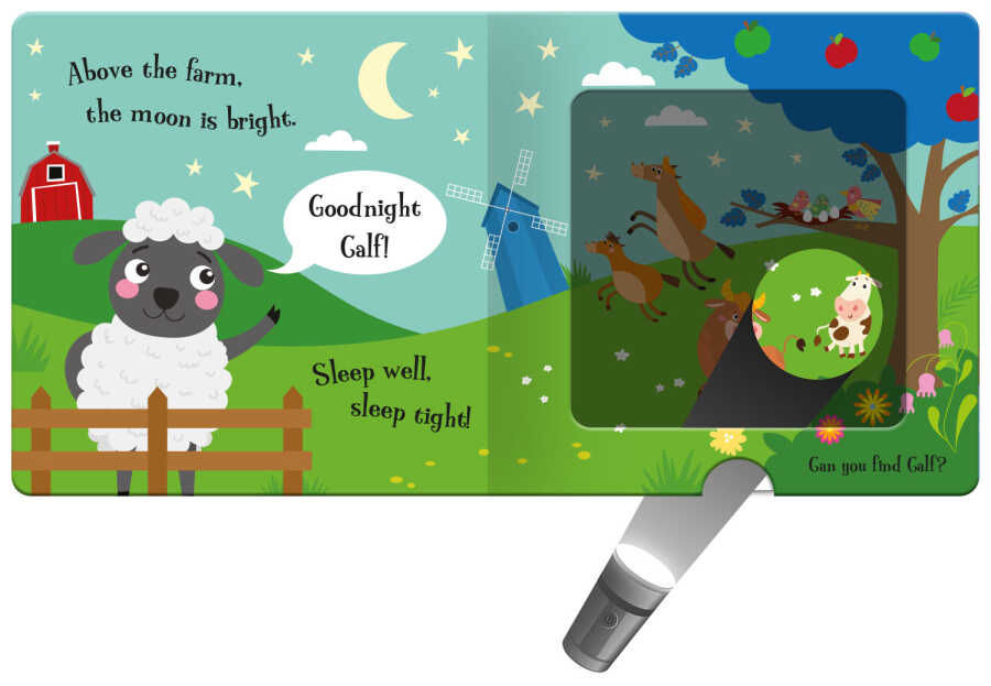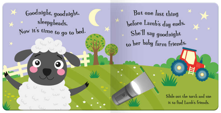 Lamb yatmaya hazır, ancak önce tüm çiftlik hayvanı yavrularına iyi geceler demek istiyor. Her gece sahnesinde Lamb'in arkadaşlarını bulmak için sihirli el fenerini sayfaların arasına yerleştirin ve çocukların neşeyle parıldamasını izleyin!