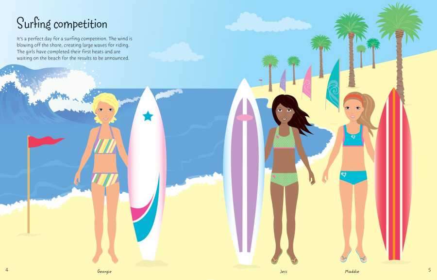 Binicilik engel atlama, jimnastik, sörf, tenis ve yüzme bu heyecan verici çıkartma kitabında yer alan sporlardan sadece birkaçıdır. Çocuklar, farklı spor etkinlikleri için karakterleri uygun kıyafetlerle giydirir.