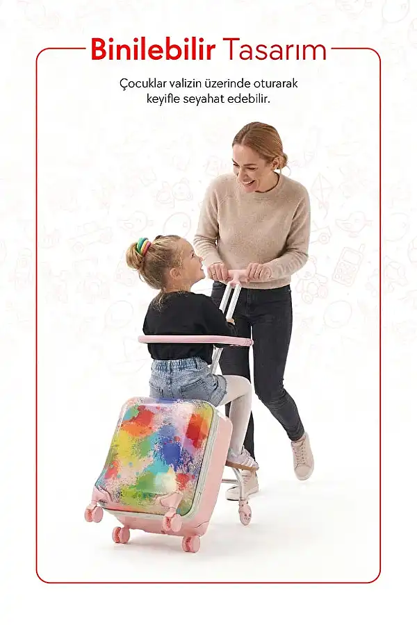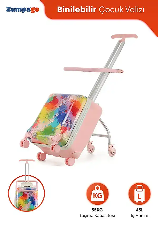 Zampago Oturabilir Çocuk Valizi Minik Gezginlerin Tatil Yol Arkadaşı! Zampago Oturabilir Çocuk Valizi, çocuklar için özel olarak tasarlanmış hem eğlenceli hem işlevsel bir seyahat çözümüdür.; Seyahatlerde çocuklarınız kendi valizini çekerken hem eğlenir hem de yorulduklarında valizlerinin üzerine oturarak dinlenebilir.; Uçak yolculuklarında, otobüs beklerken ya da havalimanında uzun yürüyüşlerde, Zampago çocuğunuzun hem taşıyıcısı hem de oturağı olur. Eğlenceli tasarımıyla dikkat çeker, sağlam yapısıyla güven verir. Ürün Özellikleri: Oturulabilir Tasarım: Dayanıklı gövdesi sayesinde çocuklar güvenle oturabilir. Maksimum taşıma kapasitesi: 50 kg Çek-İtme Kolu: Ebeveynler veya çocuklar tarafından kolayca çekilebilir. 360° Döner Tekerlekler: Harekete duyarlı, sessiz ve rahat sürüş. İç Hacim: Çocuğun giysi, oyuncak ve kişisel eşyalarını rahatça alır. Çocuk Dostu Malzeme: BPA içermez, sağlam ve hafif yapıdadır. Eğlenceli Tasarımlar: Renkli ve karakterli modellerle çocukların favorisi! Kimler İçin Uygun? 2–7 yaş arası çocuklar Tatil, hafta sonu kaçamağı, havaalanı yolculukları, okul gezileri için ideal Neden Zampago? Valiz taşıma stresini ortadan kaldırır Çocuklara bağımsızlık hissi verir Aile içi seyahatleri daha keyifli ve rahat hale getirir Tatil hazırlıkları Zampago ile başlar! Şimdi sipariş verin, minik gezginin yolculuğu daha başlamadan eğlenceye dönüşsün.